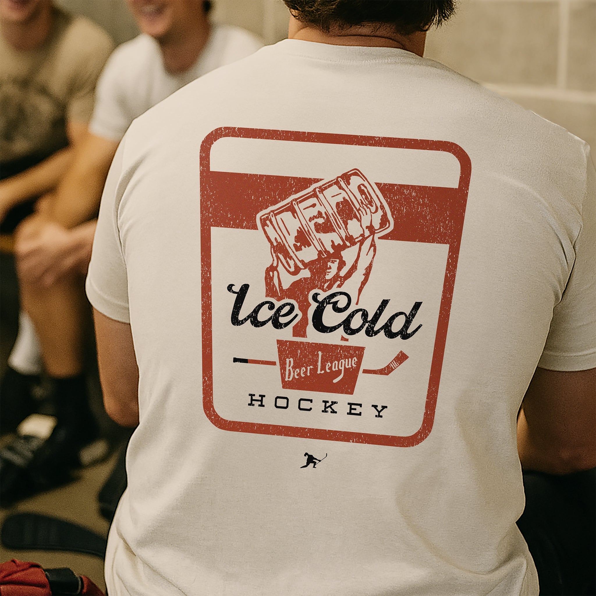 Raise that keg! A league of washed up legends, beauties + benders - all coming together for two things, hockey + ice cold brews. Get 'em both + remember, a cold one on the bench is always a good idea.